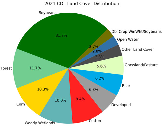 Training and validation ground-truth data were derived from the CDL. The USDA—NASS produces the CDL, which offers an annual crop type for the United States at a 30 m resolution with more than 100 crop classes [6]. Since 2006, the state-level CDL classification has been conducted using the supervised RuleQuest See5.0 [26] decision tree classification approach [27,28]. Each US state’s metadata include producer accuracy (PA), user accuracy (UA) and Kappa score, and the CDL is evaluated using a subset of ground-truth data. According to Boryan et al. [27], the primary crops in the CDL have excellent classification accuracy ranging from 85% to 95% [5]. The chart in Figure 3 displays the distribution of various land cover types in Mississippi Delta, highlighting major crops such as soybeans, corn, cotton and rice. Additionally, we included the “other” class to account for non-crop areas and different crop types from major crops.