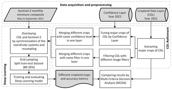 This section delineates the research methodology, with a flowchart in Figure 4 summarizing the essential steps, inputs and outputs. The inputs include monthly minimum composites of Sentinel-2 time series during the growing season, while the outputs encompass various DL segmentation evaluation metrics and maps of major crops under different conditions of confidence layer data and CDL refinements. To enhance the quality of the CDL for use as the ground-truth in the DL, two approaches are proposed: utilizing different confidence intervals of the CDL confidence layer and applying various image filters to mitigate noise and errors. Initially, CDL crop data are refined using specified confidence intervals and overlaid with Sentinel-2 imagery to create a comprehensive database. The DL model is then trained on these datasets, with accuracy metrics compared through MCDA. In the second approach, different image filters are applied to the major crops of the CDL. These refined datasets are subsequently used to train the DL model, and the results are compared to identify the most effective refinement technique.
