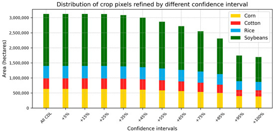 The confidence interval percentages applied to the major crop of the CDL result in a progressive reduction in the number of crop pixels within the image. As the confidence interval increases toward 100%, the number of pixels representing crops correspondingly decreases. Figure 5 quantifies this reduction, displaying the area (in hectares) occupied by different crops at each confidence interval. Notably, in some scenarios, the pixel count can be reduced by up to two times. It is crucial to understand the impact of this reduction on machine learning applications, as it directly affects the accuracy and reliability of DL segmentation outcomes. Figure 6 illustrates the distribution of major crop pixels at various confidence intervals, showing how increased confidence thresholds progressively refine the CDL.