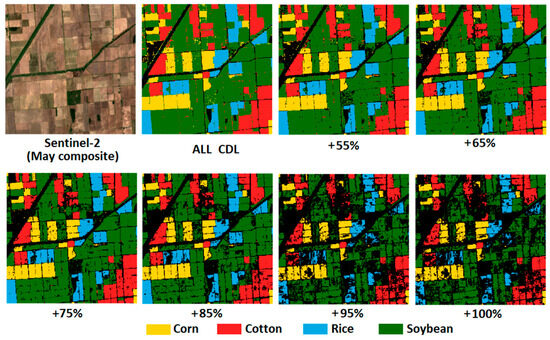 DL segmentation results of croplands from Sentinel-2 imagery. The DL models were trained using different CDL confidence layer intervals.