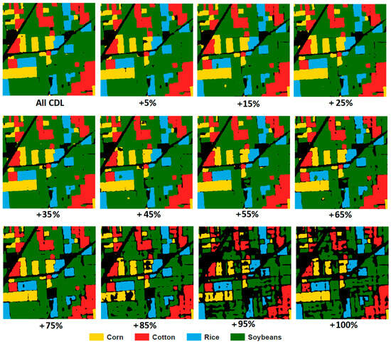To compare the effectiveness of our method, we utilized refined CDL data based on the methodology outlined in Lin et al.’s study [9]. This study aimed to identify and resolve inaccuracies in CDL crop classifications by employing a decision tree method to detect and refine questionable pixels using spatial and temporal crop information. The refined CDL (R-CDL) data were validated against high-resolution satellite images and USDA’s official acreage estimates, ensuring their robustness. By incorporating this refined dataset, we were able to benchmark our proposed methods against a well-validated standard, providing a comprehensive evaluation of our approach in relation to existing techniques.