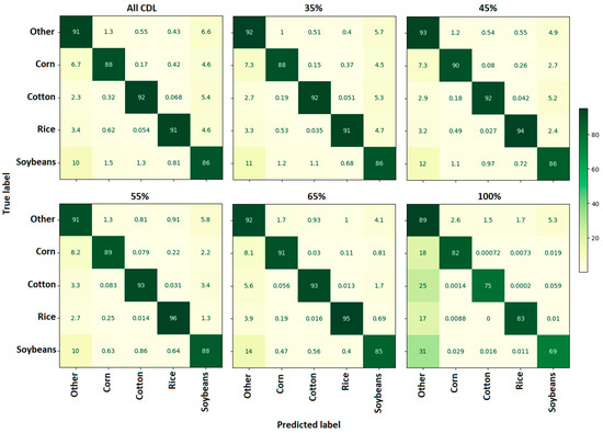 Confusion matrices illustrating the performance of DL models trained with different CDL confidence intervals in segmenting major crops. Diagonal numbers represent the percentage of correctly classified instances for each crop, while non-diagonal numbers indicate the percentage of misclassified instances between different crops.