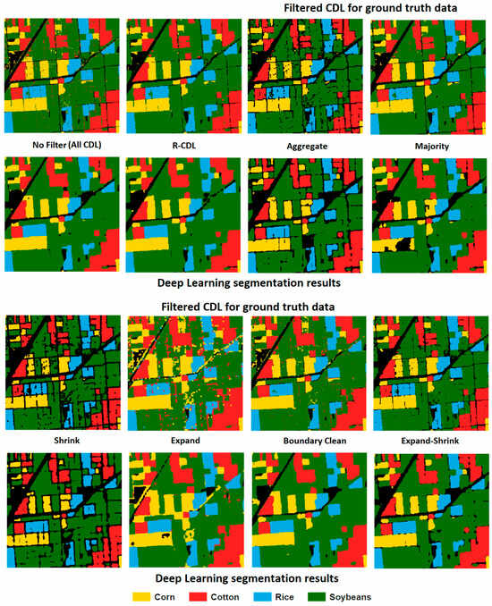 The results of the DL segmentation using various image filters on the CDL underscore the importance of data pre-processing in improving model accuracy. The majority and expand–shrink filters emerged as the top performers due to their ability to effectively reduce noise and preserve the integrity of crop boundaries. The success of the majority filter can be attributed to its ability to smooth out irregularities and enhance the homogeneity of crop areas, thereby improving the model’s ability to accurately classify different crop types. This filter’s effectiveness in maintaining clear distinctions between crops and non-crop areas, particularly along field boundaries, is crucial for accurate segmentation. Similarly, the expand–shrink filter’s ability to manage the complexities of field boundaries and reduce noise without over-segmenting highlights its robustness in handling diverse agricultural landscapes.