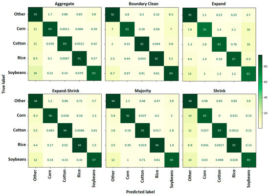 In Figure 10, the confusion matrices for different image filters applied to the CDL reveal distinct variations in the performance of DL models across major crops. The majority filter shows robust performance, particularly in identifying rice and soybeans, with higher UA and PA values compared to the other filters. This filter effectively reduces false positives and false negatives, making it highly reliable for segmenting various crop types. The expand–shrink filter also performs well, particularly in accurately identifying corn and cotton, though its performance slightly lags behind the majority filter.