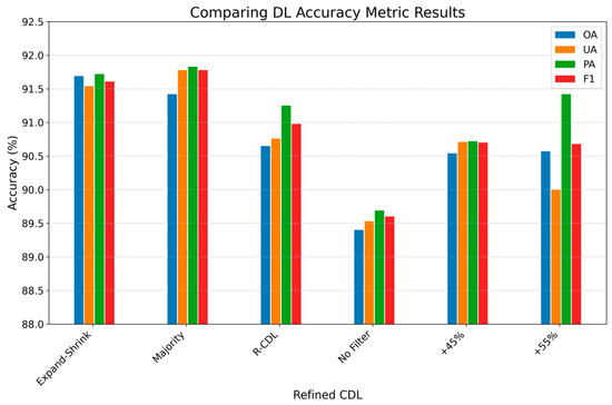 In comparing the results of our best-performing approach with the R-CDL from Lin et al.’s study [9], our findings demonstrate notable improvements. The R-CDL, which involves sophisticated steps to refine the CDL, was outperformed by the expand–shrink and majority filter approaches, which scored around 1% higher in various accuracy metrics. While our methods using the +45% and +55% confidence intervals resulted in slightly lower accuracies, they still demonstrated significant efficacy. This comparison, as illustrated in the accompanying chart in Figure 11, underscores that our simpler filter-based approaches can achieve superior or comparable accuracy metrics without the complexity of the R-CDL method, thus validating the robustness and effectiveness of our methodologies.