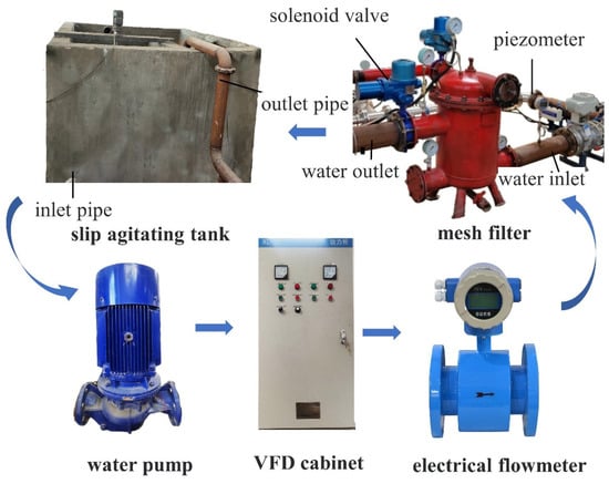 Among them, the reservoir measures 450.0 cm in length, 342.0 cm in width, and 180.0 cm in height. The centrifugal pipeline pump model is ISG125-200T, with a power rating of 37 kW and an operating frequency of 50 Hz. The flow rate in the experimental setup can be controlled by the power supply cabinet (model: XL-21, rated frequency: 50 Hz). Flow rate size was measured by an electromagnetic flowmeter (model: XFE125R1BM1R, accuracy class: 0.5, flow rate range: 13.25–500 m3/h), import and export pressure was measured by a digital pressure gauge (model: SIN-Y290, measurement range: 0–0.6 MPa, accuracy class: 0.5%). The experiment instruments also included a beaker, a cylinder, an electronic scale, and other equipment. During the experiment, the sandy water in the mixing tank flowed into the filter from the inlet pipe, was filtered by the screen, and, finally, the filtered water flowed out to the sedimentation tank from the outlet pipe.