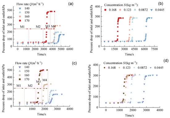 Pressure drop curves of mesh filter with time under different working conditions. (a) Different flow rates with 320 μm aperture, (b) different concentrations with 320 μm aperture, (c) different flow rates with 220 μm aperture, (d) different concentrations with 220 μm aperture.