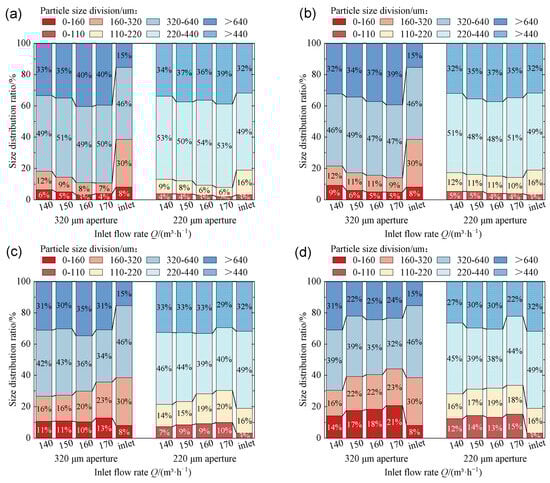 Proportions of particle size distribution at different growth stages with different flow rates: (a) M1 stage, (b) M2 stage, (c) M3 stage, (d) M4 stage.