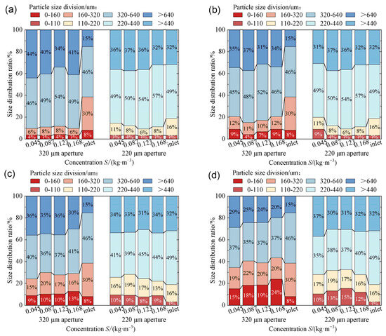 The effect of filter cake particle size distribution was investigated for each stage at various flow rates. As shown in Figure 5a,b, in the M1 stage, the percentage of filterable particles corresponding to a 320 μm aperture size at flow rates of 140–170 m3/h are 18%, 14%, 11%, and 11%, and for a 220 μm aperture size, they are 13%, 12%, 9%, and 8%. In the M2 stage, the percentage of filtered particles corresponding to 320 μm aperture size at flow rates of 140–170 m³/h are: 22%, 17%, 16%, and 14%, and for a 220 μm aperture size are: 17%, 16%, 15%, and 14%, respectively. The results showed that the percentage of filterable particles in both aperture sizes decreased with an increasing flow rate in the M1 and M2 stages of cake growth. It was found that the smaller the particle size, the stronger the particle followability.. Therefore, smaller particles were more likely to pass through the filter holes as the flow rate increased due to fluid movement, leading to a decrease in the percentage of filterable particles. The effect of an increase in flow rate on the size distribution of particles forming the filter cake in the M3 stage was not obvious. In the M4 stage, the proportion of filtered particles in the size 320 μm aperture increased from 30% to 44%. Additionally, the proportion of filtered particles in the size 320 μm aperture increased from 28% to 33% with the rise in flow rate. This indicated that in the cake filtration stage, as the flow rate increases, more filterable particles enter the cake layer. The higher the flow rate, the greater the sand-holding force of the water flow, and the stronger the movements of the small particles. Due to the small particle size of the filterable particles, they could enter the pores of the filter cake under the influence of the water flow’s sand-holding force. This resulted in an increased proportion of filterable particles and the formation of a denser filter cake. Upon analyzing Figure 6, it is evident that the percentage of particle size distribution remained consistent across different concentrations for each growth stage. This indicated that the concentration has essentially no effect on the particle size distribution of the filter cake.