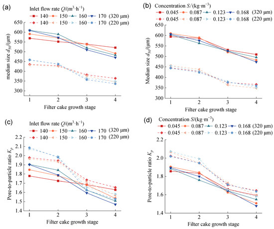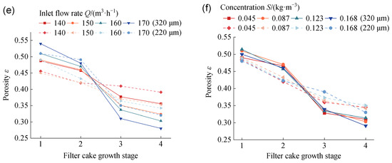Changes in filter cake parameters at different growth stages: (a) median particle size d50 varies with the growth stage at different flow rates, (b) median particle size d50 varies with the growth stage at different concentrations, (c) pore-to-particle ratio Kp varies with the growth stage at different flow rates, (d) pore-to-particle ratio Kp varies with the growth stage at different concentrations, (e) porosity ε varies with the growth stage at different flow rates, (f) porosity ε varies with the growth stage at different concentrations.