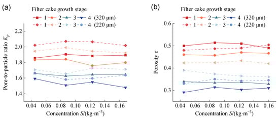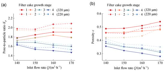 Structural parameters of filter cake with different flow rates: (a) pore-to-particle ratio Kp, (b) porosity ε.