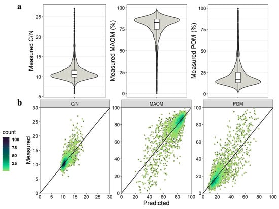 (a) Box–violin plot of measured C/N ratio, mineral−associated organic matter (MAOM), and particulate organic matter (POM) from the German Agricultural Soil Inventory. (b) Scatterplot of measured versus predicted values for C/N, MAOM, and POM ensemble models.