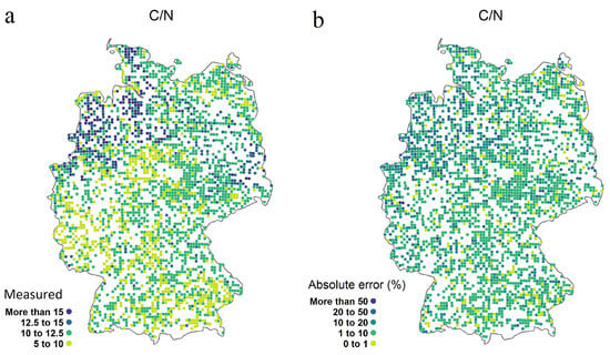 The spatial distribution of the absolute percent error of the C/N ratio and especially of MAOM coincide with the extreme values of these two response variables, with the highest values in the northwest (Figure 2). Various factors contribute to the clustered spatial distribution of the C/N ratio, MAOM, and POM. For instance, Poeplau and Don [72] reported that POM levels were nearly double in top10 grassland areas compared with croplands, which was attributed to greater C input from the abundant root systems and constant vegetation in grasslands [73]. Considering that northwest Germany predominantly comprises grasslands and the northeast is mainly utilized for cropland, this can partly explain the regional gradients in the POM and MAOM fractions. The diverse soil types associated with these land uses also play a role in these variances [73]. Soil types could affect soil texture and moisture content, which in turn can influence a soil’s capacity to stabilize SOC as MAOM [73]. The high fractions of POM in the northwest can also be traced back to historical land use with peatland and heathland in this region [73]. Furthermore, the north–south gradient can be connected to a sandier soil texture in the north, and a siltier, clayey soil in the central and southern regions. Consequently, the coarse soil texture of the north provides less available surface on mineral particles, affecting OM stabilization [74]. Additionally, the northern region of Germany can mostly be characterized by its low pH [75] which reduces the microbial activity and decomposition rate, aiding the retention of plant materials as POM. All these factors highlight the importance of soil-forming factors for SOM quality indicators, such as C/N ratio, POM, and MAOM, within Germany.