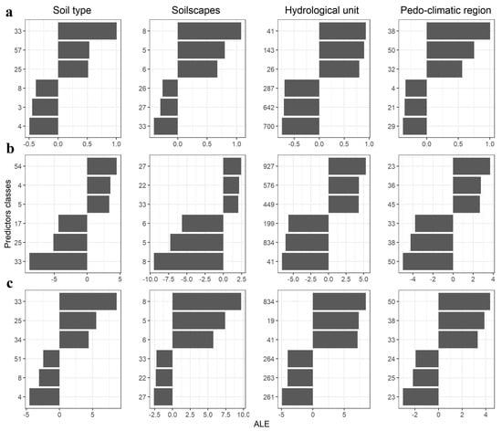 The importance of the soil and parent material group for model performance can be explained by the four predictors in this group. These predictors describe soil by different attributes that are directly associated with the response variables, such as soil type, pedo-climatic characteristics, or hydro-geochemical properties (Figure S2). The main effect of each predictor in this group on the response variable was assessed using first-order ALE due to its robustness against potential dependency among predictors and its lower computational cost [66,78] (Figure 4). The first-order ALE of each predictor class is represented by a bar in Figure 4. Each bar is interpreted as the main effect of that class relative to the average data prediction, which is centered at 0.