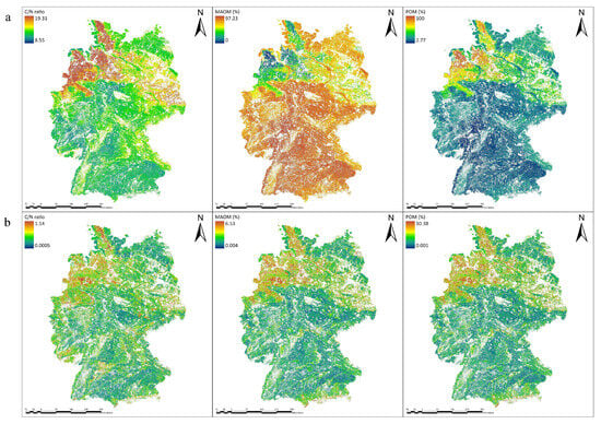 (a) Spatial prediction of the C/N ratio, mineral−associated organic matter (MAOM) (%), and particulate organic matter (POM) (%) for the top 10 cm of German mineral agricultural soil, with (b) the corresponding model uncertainty.