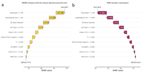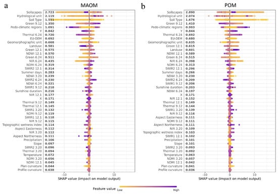 As mentioned above, the C/N and MAOM models exhibited high and good performance, respectively, according to their MAPE. However, this naturally leads to the question of why the POM model did not demonstrate a similar performance to that of the MAOM model. Such a disparity was unexpected, especially considering that POM and MAOM share an inverse relationship with their sum adding up to 100%. In other words, these two response variables have an inverse function. Thus, the initial assumption was that the POM model should be able to obtain the necessary information from a similar feature space from which MAOM conveyed high accuracy. To gain a visual insight into the models’ behaviors, the Shapley method, described in Section 2.5.2, was employed for each group. This helped decompose the MAOM and POM models, cross-examine them, and discern any variances in how the models accessed information from their respective feature spaces during the training phase.