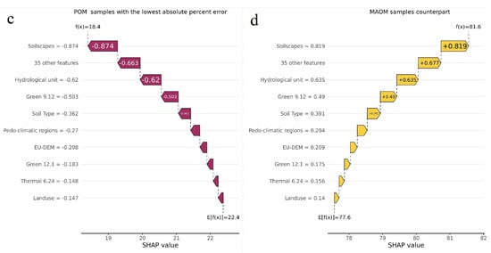(a) Contribution of predictors in the mineral−associated organic matter (MAOM) model for samples with the lowest absolute percent error, (b) the same samples in the particulate organic matter (POM) model, (c) the POM model for the samples with the lowest absolute percent error, and (d) the same samples in the MAOM model. is the mean predicted value of all samples. is the mean of the predicted values for the given samples. The numbers on the y-axis indicate the mean contribution of a given predictor to the final prediction of the given samples.