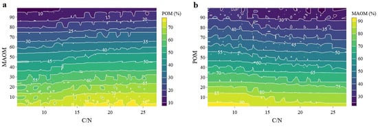 The modified RC framework was implemented to identify the relationship of the response variables. Figure 8 presents second-order PDP plots that clarify the main effect and interaction effect of the two predicted response variables when used as additional predictors to predict another response variable. Figure 8a reveals that higher values of the predicted C/N ratio and lower predicted MAOM values lead to an increase in predicted POM. Notably, the white horizontal lines in the figure demonstrate an interaction between the predicted MAOM (especially in its lower range) and predicted C/N ratio (specifically when it is above approximately 15). This interaction results in the highest predicted POM in the model. Figure 8b displays the inverse of what is shown by Figure 8a because the predicted MAOM was substituted by POM.
