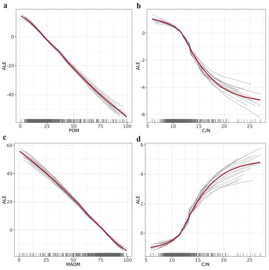 The first-order ALE (Figure 9) was used to isolate the main effect of a single response variable in the modified RC model when employed as a predictor. For these response variables, the main effect could only be evaluated by the first-order ALE, given the interdependence between POM, MAOM, and the C/N ratio. Figure 9a,c depict a negative linear correlation between POM and MAOM in their corresponding models. This echoes their inverse relationship previously discussed. Each grey line in the figure represents a fold in the CV for which ALE was calculated. The divergence of the grey lines indicates the effect of model uncertainty on ALE, exacerbated by the scarcity of samples at extreme values. In contrast, model uncertainty drops near the central tendency of the data, as denoted by the rug plot (Figure 9). Figure 9b,d demonstrate that the C/N ratio has a logistic relationship with two other response variables. This logistic relationship suggests that diverse mechanisms control the interaction between the response variables. The slope of the red line, the interpolated line, indicates that the C/N ratio has a linear relationship with POM (Figure 9d) and an inverse one with MAOM (Figure 9b) in the majority of German soils. These are generally the finer-textured soils encompassing vast stretches of the country, especially the central and southern regions as explained above. However, the linear relationship does not continue in soils characterized by a high C/N ratio, typical of the sandy soils in the north. A plausible rationale for such a nonlinear relationship is the variety in the decomposition rate of SOM in this region [94]. This could be driven by multiple factors, including the nutrient quality of SOM spread across the north of Germany [94] and the pH gradient from the northeast to the northwest, with the latter having the country’s lowest pH [75]. This heterogeneity in SOM decomposition intensifies in the northeast and central northern regions, contrasting with the northwest [94]. These soils essentially mediate between the central and southern regions, as manifested in the linear portion of the figures (Figure 9b,d), and the northwestern soils, which have the highest C/N values. Consequently, it is conceivable that the heightened variability of factors affecting the response variables in this particular region, compared with the rest of the country, amplifies the variability in the response variables (Figure 5). This, in turn, leads to a nonlinear relationship between the C/N ratio and the two other response variables.