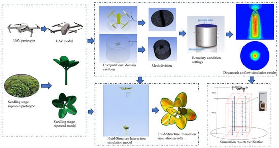 The comprehensive methodology and conceptual framework of this study are depicted in Figure 1. Initially, a three-dimensional simulation model integrating both the UAV and seedling-stage rapeseed was constructed. Subsequently, the simulation of downwash airflow generated by the UAV in hovering mode was demonstrated. Following this, a simulation was conducted to model the interaction between the downwash airflow and the seedling-stage rapeseed, utilizing a fluid–solid coupling approach. Finally, the accuracy of the simulation results pertaining to UAV hovering and downwash airflow was validated.