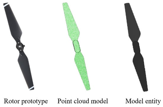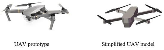 A UAV simulation model based on the DJI MAVIC PRO quadcopter was developed. Due to the complex surface and relatively low accuracy of forward modeling of the UAV rotor, three-dimensional reconstruction methods were employed for precise fitting of its intricate surfaces [18]. This involved reverse three-dimensional reconstruction of the UAV rotor through four sequential processes: point cloud acquisition, point cloud processing, surface fitting, and model finalization (Figure 2). Simultaneously, the UAV body was simplified by excluding components such as the onboard camera. This simplification did not significantly affect the overall distribution of the rotor’s downwash airflow [19]. The simplified model was suitable for conducting downwash airflow simulations, as illustrated in Figure 3, both before and after simplification.
