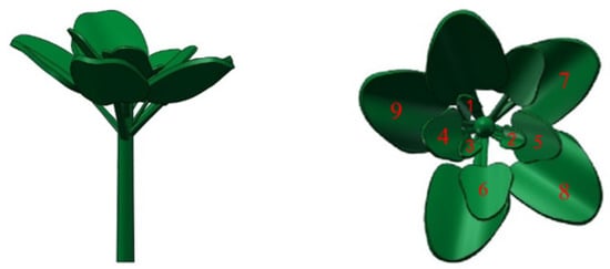 The variety “Shuang 11” is widely planted locally in rapeseed cultivation. This study has established a three-dimensional model of rapeseed seedlings, taking into account the size of the “Shuang 11” rapeseed variety during the seedling stage. The model’s height is standardized at 60 cm, with the leaf area of the rapeseed primarily distributed across three distinct gradients: 10 cm2, 50 cm2, and 110 cm2. Specifically, leaves numbered 1–3 are allocated an area of 10 cm2 each, leaves numbered 4–6 possess an area of 50 cm2 each, and leaves numbered 7–9 exhibit an area of 110 cm2 each (refer to Figure 5). Concurrently, to more faithfully simulate the mechanical response of rapeseed, this paper attributes three different mechanical property parameters to the rapeseed model (see Table 2).