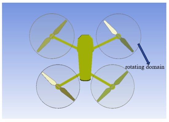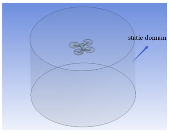 In the context of CFD fluid calculations, it has been established that the simulation time required for a quadcopter UAV to attain stable downwash airflow is 4 s [22]. Consequently, to ensure ample calculation time, this study designated the time domain to encompass 5 s. Furthermore, for computational expediency, the sliding mesh method was adopted, a technique commonly employed in rotating machinery simulations, to construct the computational domain. The computational domain was partitioned into two distinct segments: the rotating domain and the static domain. The rotating domain delineated the region corresponding to the rotational area of the UAV rotor (refer to Figure 6), whereas the static domain represented the airflow region external to the UAV (refer to Figure 7). The fundamental principle underlying the sliding grid method entails segregating the intricate and dynamic rotational airflow region from the external airflow domain, thereby mitigating computational overhead and forestalling simulation termination attributable to calculation errors [23]. Throughout the simulation calculation process, data exchange between the rotating and static domains occurred via the contact surface, thereby facilitating the simulation of the entire fluid domain.