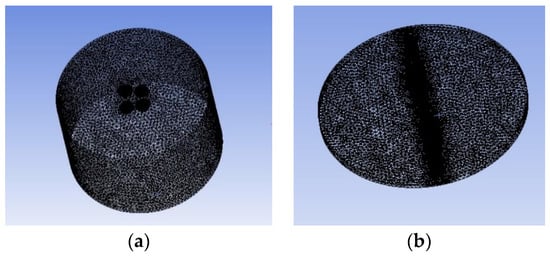 The rotating domain poses significant challenges for airflow analysis, primarily due to the curved surface of the rotor, which creates irregular regions within the calculation domain and can compromise mesh quality. In this study, we addressed this issue by employing unstructured meshing to refine the mesh in the complex-shaped rotating domain. Specifically, a mesh size of 1.2 mm was chosen, resulting in a total of 70,102 mesh elements. Simultaneously, to optimize processing efficiency in the stationary domain, a coarser grid setting was implemented. Grid sizes increased gradually outward from the interface position of the rotating domain, reaching a maximum size of 50 mm. The static domain was composed of a total of 600,321 grid cells. Mesh quality was evaluated using Skewness as the criterion, with the overall mesh quality of the fluid domain achieving a rating of 0.71, meeting the required standards. The results of the meshing process are depicted in Figure 8.