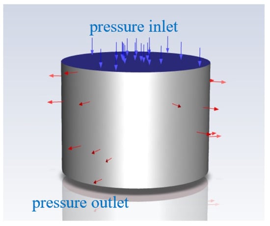 In CFD numerical calculations, solely the fluid domain undergoes computation, necessitating clear delineation of its boundaries. Boundary conditions serve to directly characterize fluid flow at these boundaries. In this study, the contact surface between the rotating domain and the static domain was designated as the interface. The upper surface of the static domain was identified as the pressure inlet, while the lower surface served as the wall boundary. The cylindrical surface was assigned as the pressure outlet, with each boundary endowed with specific physical meanings (refer to Figure 9). Throughout the simulation process, airflow entered through the pressure inlet and exited via the pressure outlet, mirroring the actual airflow pattern. Additionally, the rotational speed of the rotor was prescribed at 550 rpm based on real-flight parameters, with adjacent rotors rotating in opposite directions.
