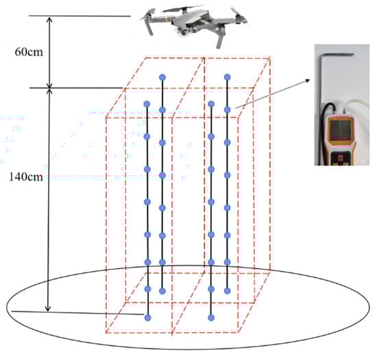 To validate the simulation results of the downwash airflow generated by a quad-rotor UAV at various hovering heights, this study employed a Pitot tube wind speed sensor to measure the wind speed of the UAV’s downwash airflow. The spatial distribution of the test points is depicted in Figure 11. These test points were primarily concentrated within the height range of 0 to 1.4 m above the ground and were predominantly located in the lower space beneath the four rotors of the UAV. Each rotor had eight test points positioned beneath it. At each test point, the probe of the wind speed sensor was placed and, once the sensor reading stabilized, the wind speed at the test point was recorded. Each test point measurement was repeated three times, and the average value of the recorded data was calculated to ensure data accuracy. This experimental design aimed to verify the accuracy of the numerical simulation through actual wind speed measurements and provided experimental support for the simulation outcomes.