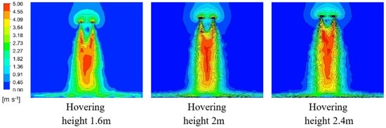 Upon reaching a steady state, the downwash airflow is predominantly concentrated directly beneath the rotor. To investigate the evolving characteristics of the rotor downwash airflow, the airflow under steady-state conditions was selected for analysis. Figure 12 illustrates the airflow velocity distribution in the XOZ plane at three distinct hovering heights of the UAV. Given the circumferential distribution of the four rotors, the velocity distribution of the downwash airflow exhibited approximate symmetry on the XOZ plane. Notably, the concentration area of the downwash airflow velocity was situated within the central region, ranging from 0.2 m to 1.2 m directly below the quadrotor. Furthermore, the airflow velocity gradually diminished in the downward direction. Across the three hovering heights considered, the maximum airflow velocities recorded were 4.8 m/s, 4.7 m/s, and 4.5 m/s, respectively. It was noteworthy that these maximum flow velocities were consistently observed in the region where the downwash airflow of adjacent rotors intersected and overlapped, approximately 0.4 m below the UAV.
