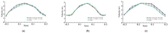 Changes in airflow velocity along the X-axis in the XOZ plane at different heights from the ground: (a) Hovering height 1.6 m; (b) Hovering height 2.0 m; (c) Hovering height 2.4 m.
