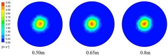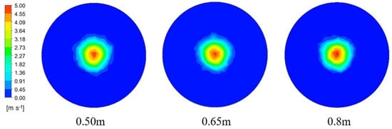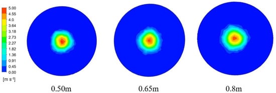 Figure 14, Figure 15 and Figure 16 depict the XOY plane airflow velocity distribution diagrams at various hovering heights of the UAV. With the UAV’s hovering height increasing, the coverage area of the XOY plane downwash airflow at the same height above the ground progressively expanded, while the maximum speed at its central position gradually diminished. At a hovering height of 1.6 m, the maximum speed of the XOY plane within the range of 0.5 to 0.8 m above the ground was concentrated near the center of the plane (Figure 14), with the speed gradually decreasing from the center towards the periphery, and the airflow coverage area expanding as the height above the ground increased before gradually contracting. The variation range was within 0.489–0.548 m2.