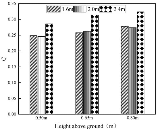 The wind speed variation coefficient of the UAV at different hovering heights is depicted in Figure 17. At a hovering height of 1.6 m, the XOY plane airflow velocity variation coefficients at heights of 0.5 m, 0.65 m, and 0.80 m above the ground were 0.249, 0.258, and 0.278, respectively. When the hovering height was increased to 2 m, the airflow variation coefficients at each height above the ground were 0.246, 0.262, and 0.274, respectively, showing no significant difference from those observed at a hovering height of 1.6 m. However, at a hovering height of 2.4 m, the variation coefficients of airflow velocity above the ground were 0.286, 0.314, and 0.324, respectively, indicating a notable increase compared to the first two hovering heights. A larger coefficient of variation denotes a more uneven distribution of air velocity. Therefore, at a hovering height of 2.4 m, the flow field distribution exhibited the greatest degree of unevenness.