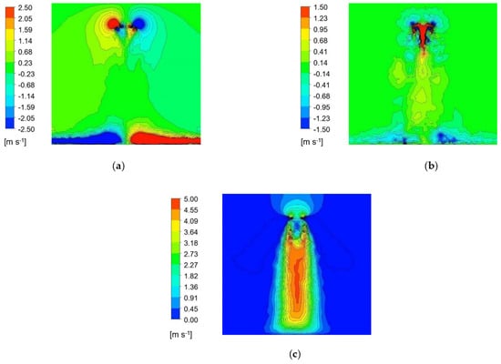 Distribution of airflow velocity components in each direction of the XOZ plane: (a) X-direction velocity component; (b) Y-direction velocity component; (c) Z-direction velocity component.