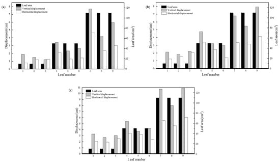 This study extracted the displacement data of the leaf tips from nine rapeseed leaves with leaf areas of 10 cm2, 50 cm2, and 110 cm2. Figure 20 illustrates the displacement of the leaf tips of the rapeseed model in both horizontal and vertical directions under three different mechanical property parameters.