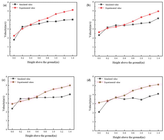 Simulation values and experimental values of UAV downwash airflow velocity: (a) Rotor1; (b) Rotor2; (c) Rotor3; (d) Rotor4.