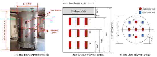 A pilot experimental silo with three tonnes capacity was made of stainless steel by the Scientific Research Institute of the State Administration of Grain and Material Reserves (Figure 2a). Fifteen electronic probe traps were placed at three levels: Top (1.8 m), Middle (1.2 m), and Bottom (0.6 m) (Figure 2b). Five traps and four pest release points were located at each level (Figure 2c).