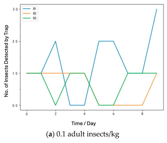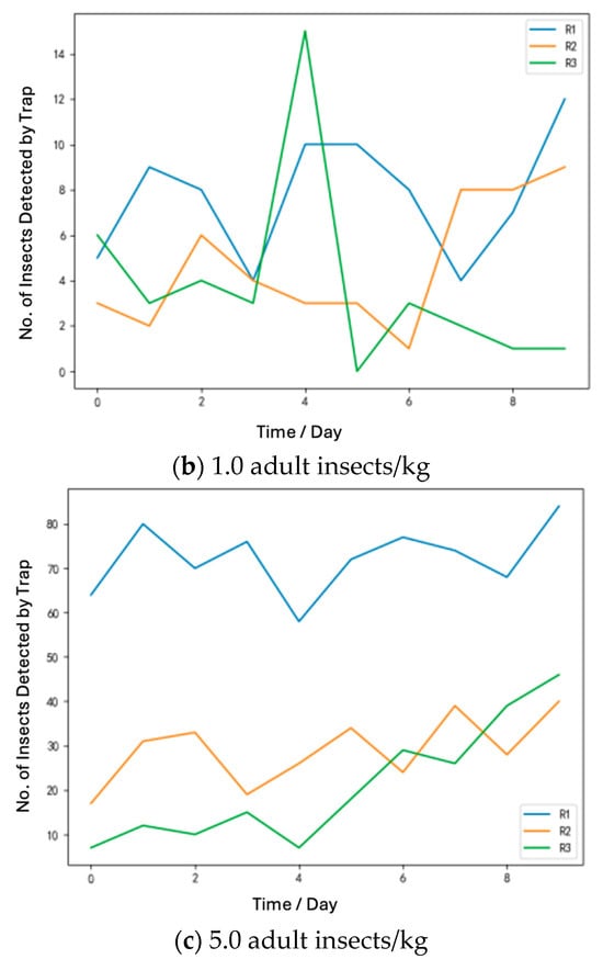 Time series chart of the daily catch of 15 traps in three repeated experiments at 0.1 insect/kg, 1.0 insect/kg, and 5.0 insect/kg. R1, R2, and R3 represent the three repeated experiments that were conducted.