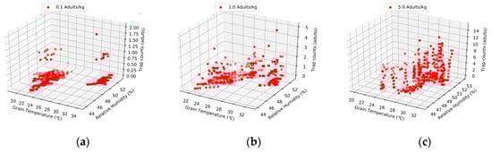 Three-dimensional scatter plots of daily average rice temperature, relative humidity, and trap capture quantity per probe at three different pest population densities: 0.1 (a), 1.0 (b), and 5.0 (c) adults/kg.
