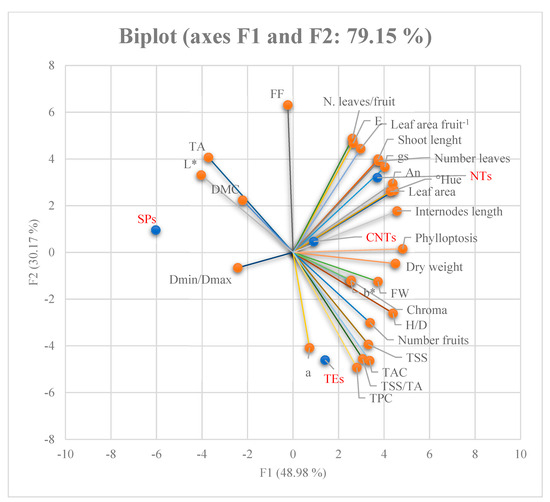 The hydraulic conductance values were similar for the TEs and NTs, but significantly lower for the SPs. No measurement was recorded for CNTs (Table 7). Principal Component Analysis (PCA) allowed us to study the relationships between the original variables to find a new, smaller set that expressed commonalities between the original items; this facilitated the identification of factors that are not directly observable (latent variables or common factors) while maintaining a high explained variability. The variables strongly correlated with and belonging to factor F1 related to characteristics of the fruit, such as its fresh weight, H/D ratio, TSS, DWF, colour parameters L* and Hue, and antioxidant capacity. Leaf photosynthesis (An) and other variables of the shoot such as conductance, length, leaf area, internode length, and leaf drop also exhibited a strong correlation with factor F1. Fruit variables such as pulp firmness, dry weight content (%), polyphenol total content, the number of leaves per fruit, and the leaf area per fruit were strongly correlated and were categorised as factor 2. Finally, the colorimetric variables of the pulp a, b, and chroma, the minimum and maximum diameter ratio of the fruit, and the number of fruits per shoot were strongly correlated and were assigned to F3 (Figure 1).
