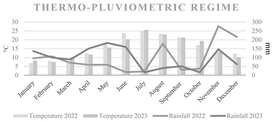 Thermo-pluviometric regime of the 2022–2023 biennium of the area of interest.
