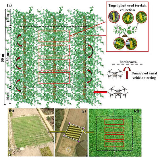 (a) Experimental design, (b) aerial photography of the experimental area, (c) unmanned aerial vehicle application route, and (d) target area used for data collection.