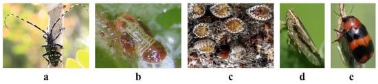 Visual representation of the dataset. (a) Longhorn beetle, (b) scale insect, (c) psyllid, (d) black leaf beetle, and (e) mealybug.