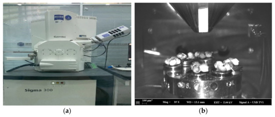 The scene graph of the SEM analyzer (a) and the prepared samples (b).