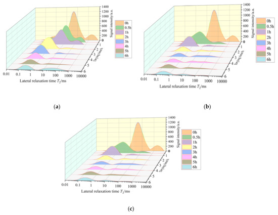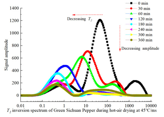 The dried samples under drying temperatures of 45, 55 and 65 °C were respectively analyzed by the LF-NMR analyzer, and the experimental data showed similar trends in the changes of T2 inversion spectra for the three sets of samples. Therefore, the T2 inversion spectrum of the samples during the drying process at 45 °C was adopted as the representative case to investigate the moisture migration and changes within Green Sichuan Pepper during the drying process. The variations of transverse relaxation time with signal amplitude during the drying process at 45 °C are depicted in Figure 4.