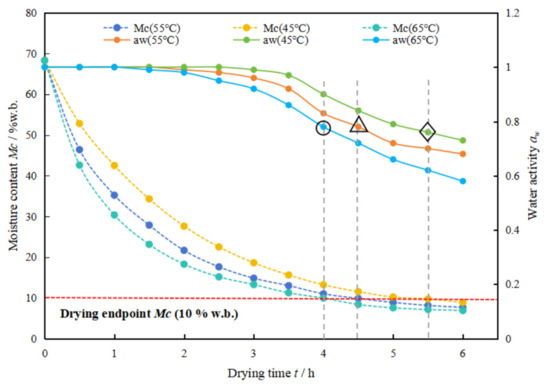 In order to further investigate the changes of the moisture states during the drying process, the water activities of the samples dried at drying temperatures of 45, 55 and 65 °C were also measured by a water activity meter (AW-2), and the variations of the water activities and the moisture content with the drying time are depicted in Figure 6. Obviously can be drawn from Figure 6 that the drying rate increases with the drying temperature, and the drying time to reach the drying endpoint 10%w.b. [31] at drying temperatures of 45, 55 and 65 °C were determined to be 5.5 h, 4.5 h and 4 h, respectively, and the corresponding aw of the dried samples are 0.789, 0.782, and 0.778, respectively. On the other hand, it can be seen from the Figure that the aw for 65 °C performs a downward trend at 1 h, while the aw for 55 °C performs a downward trend at 1.5 h and the aw for 45 °C performs a downward trend at 2 h. This indicates that the free water inside the samples dried at 45, 55 and 65 °C were respectively removed or transformed to immobile water at 1 h, 1.5 h, and 2 h, which can corroborate the LF-NMR results shown in Figure 5. Furthermore, by comprehensively comparing the LNF-NMR analysis in Figure 5 and the sample water activity variations shown in Figure 6, it can be summarized that a higher drying temperature can significantly increase the free water removal rate, while it has a smaller influence on the bound water removing rate and a significant influence on the immobile water removal rate under a drying temperature of 65 °C.