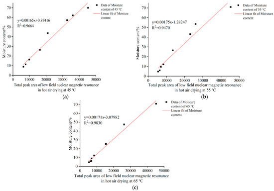 Based on the established models, the fitted curves between the MC and A2 are depicted in Figure 7. As can be seen from the Figure, there is a significant linear relationship between the total peak area A2 and MC at different drying temperatures, and the determination coefficients (R2) for the fitted curves at 45, 55 and 65 °C were 0.9664, 0.9470 and 0.9830, respectively, indicating that the models show a reliable fitting performance and can be used for predicting the MC during the drying process.