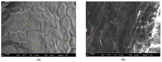 As can be seen from Figure 8a, the Green Sichuan Pepper pericarp surface mainly consists of three components, including the surface structure, pore structure and the oil chamber structure, which are respectively characterized by the “rectangle”, “circle” and “triangle” in Figure 8a. The local surface structure possesses a slight fold phenomenon, while the whole surface possesses a grid mesh phenomenon. The oil chamber structure is the main place for storing essential oils, which is manifested as irregular protrusions, as shown in the Figure. The pore structure is the key component to transport the water from the inside to the outside of the sample, which possesses a flat shape on the surface and a three-dimensional tubular shape at the cross-section of the pericarp, as shown in Figure 8b.