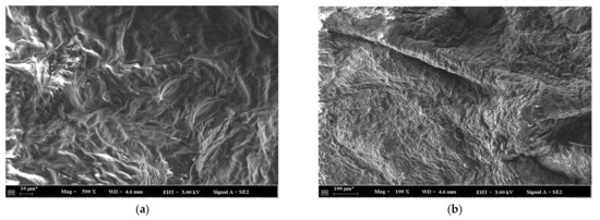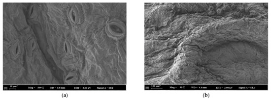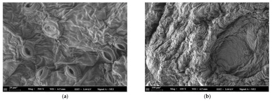 During the drying process, the inside water migrates from the pore structure driven by the temperature, pressure and moisture concentration gradients; however, the pore structure varies with the variations of the drying conditions. Accordingly, based on the analysis mentioned above, an experimental study on the microstructure of the samples dried at 45, 55 and 65 °C has been conducted using SEM technology. Meanwhile, in order to investigate the variations of the pore structure with the drying time, and at the same time, by reducing the number of scanned samples, the microstructures of Green Sichuan Pepper pericarp at 60 min and 360 min with drying temperatures of 45, 55 and 65 °C were respectively investigated, and the results are depicted in Figure 9, Figure 10 and Figure 11.